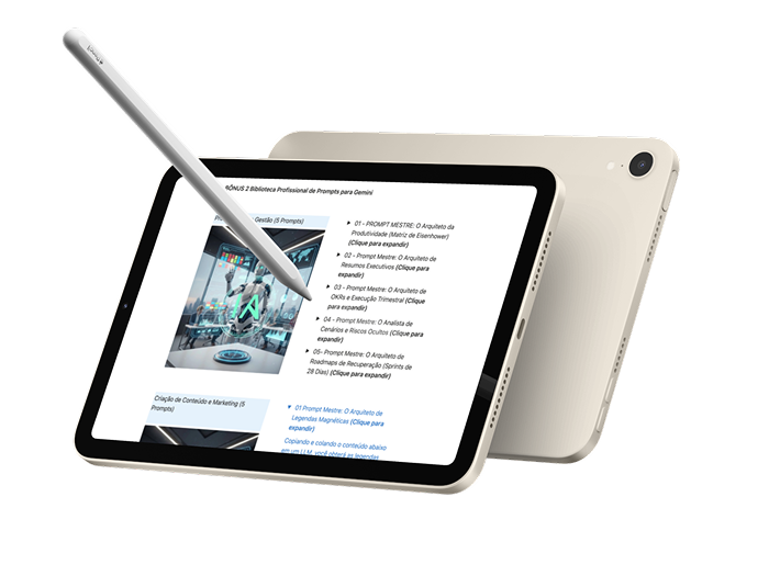 O Gemini 360º ensina qualquer pessoa a usar o ecossistema completo do Google com método, do primeiro prompt ao assistente de IA que executa tarefas por você, sem precisar saber programar.